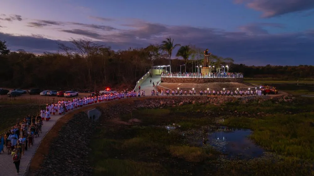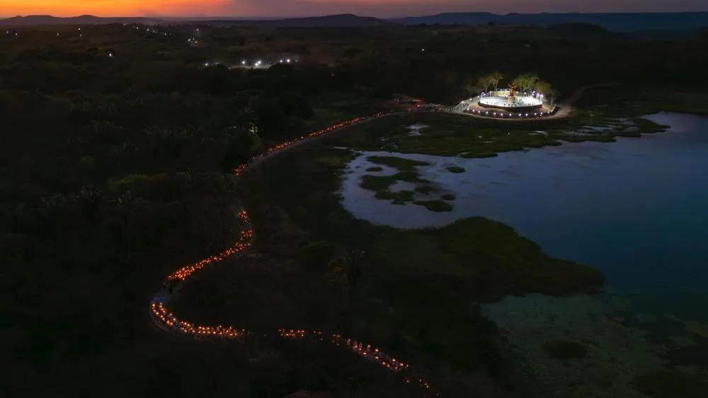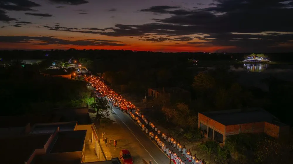 Ao cair da noite, a procissão luminosa tomou a orla da lagoa, iluminada por velas e pelo brilho da fé do povo. Caminhando em direção ao Santuário, os fiéis entoavam cânticos e orações, criando um cenário de emoção e espiritualidade que tocou o coração de todos os presentes.