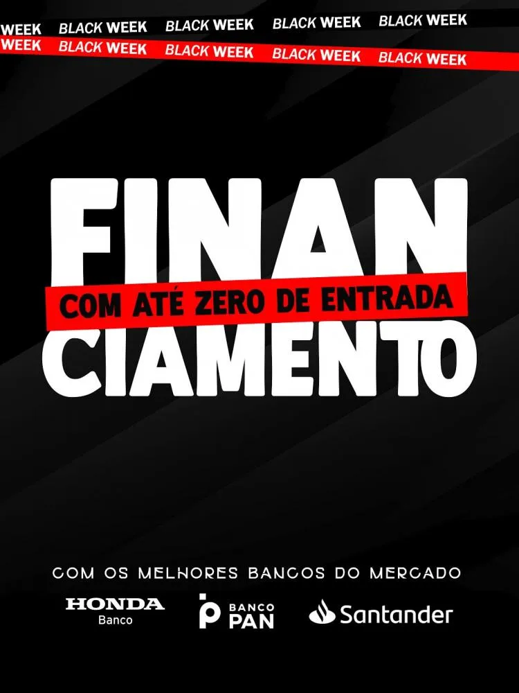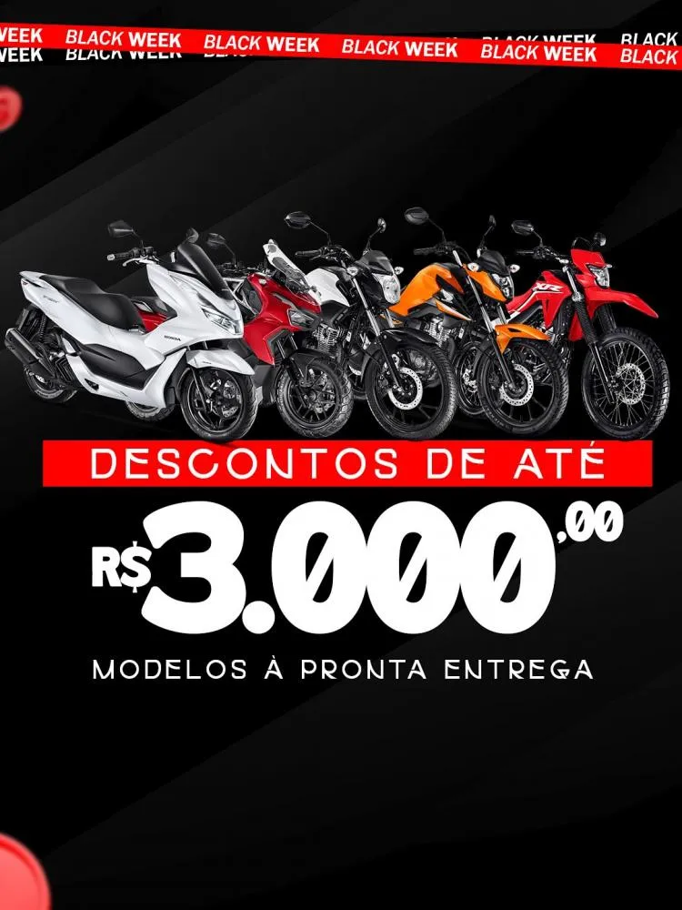 A Black Week antecipada da Parnauto chegou e vai até 11 de outubro! É a sua chance de sair de moto zero quilômetro pagando menos: modelos selecionados com até R$3.000 de desconto e financiamento com 0 de entrada pelos bancos credenciados.