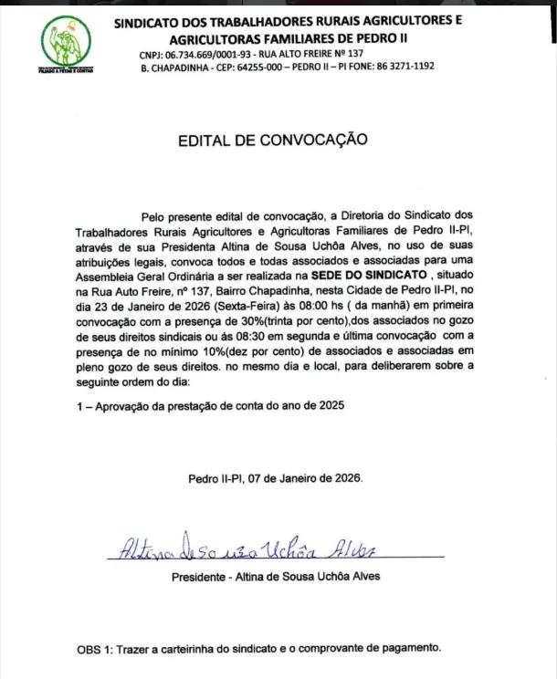 A Diretoria do Sindicato dos Trabalhadores Rurais Agricultores e Agricultoras Familiares de Pedro II publicou edital convocando os(as) associados(as) para participarem da Assembleia Geral Ordinária da entidade. A reunião será realizada nesta sexta-feira (23), a partir das 8h, na sede do sindicato, localizada na Rua Alto Freire, nº 137, no bairro Chapadinha, em Pedro II.