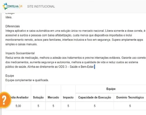 Decidimos submeter três ideias ao Programa Centelha, uma das principais iniciativas de incentivo à inovação no Brasil, que busca transformar ideias em negócios com potencial de impacto. Para nossa alegria, as três ideias receberam boas avaliações, com pontuações significativas. E, segundo os critérios do edital, duas delas foram aprovadas na fase preliminar, sendo que uma destas foi avaliada com nota máxima, um resultado que nos encheu de orgulho e, acima de tudo, de responsabilidade.