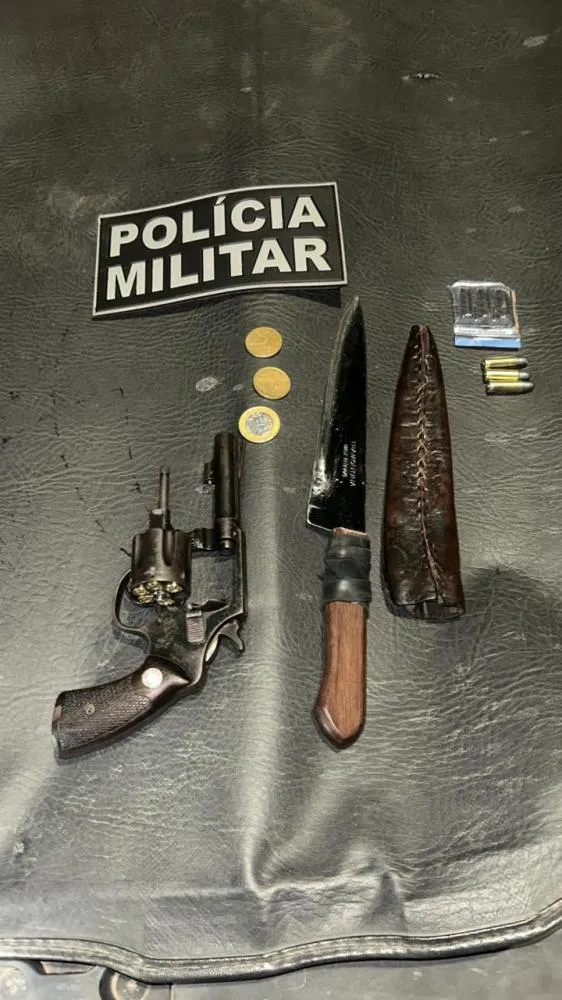 Os policiais se deslocaram até o endereço informado e realizaram a abordagem do suspeito. Durante a revista pessoal, foram encontradas com ele uma faca e três munições de revólver calibre .32. Em seguida, a equipe estendeu a revista ao veículo do homem, onde localizou um revólver do mesmo calibre.