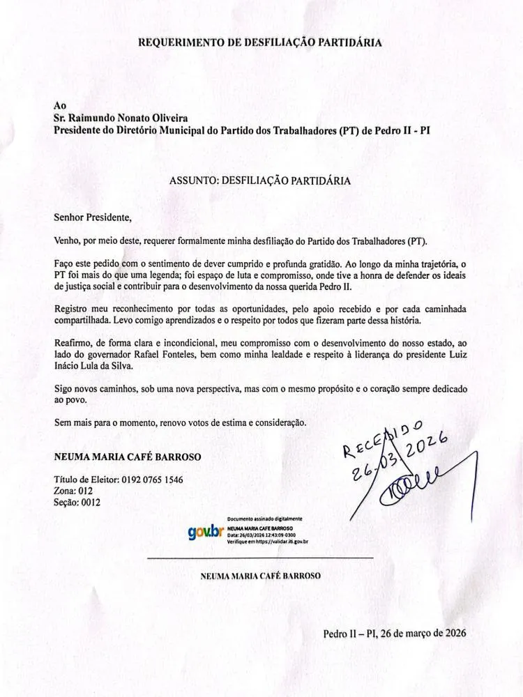 Nesta quinta-feira (26), a ex-prefeita de Pedro II, Neuma Maria Café Barroso, anunciou, por meio de suas redes sociais, a desfiliação do Partido dos Trabalhadores (PT).