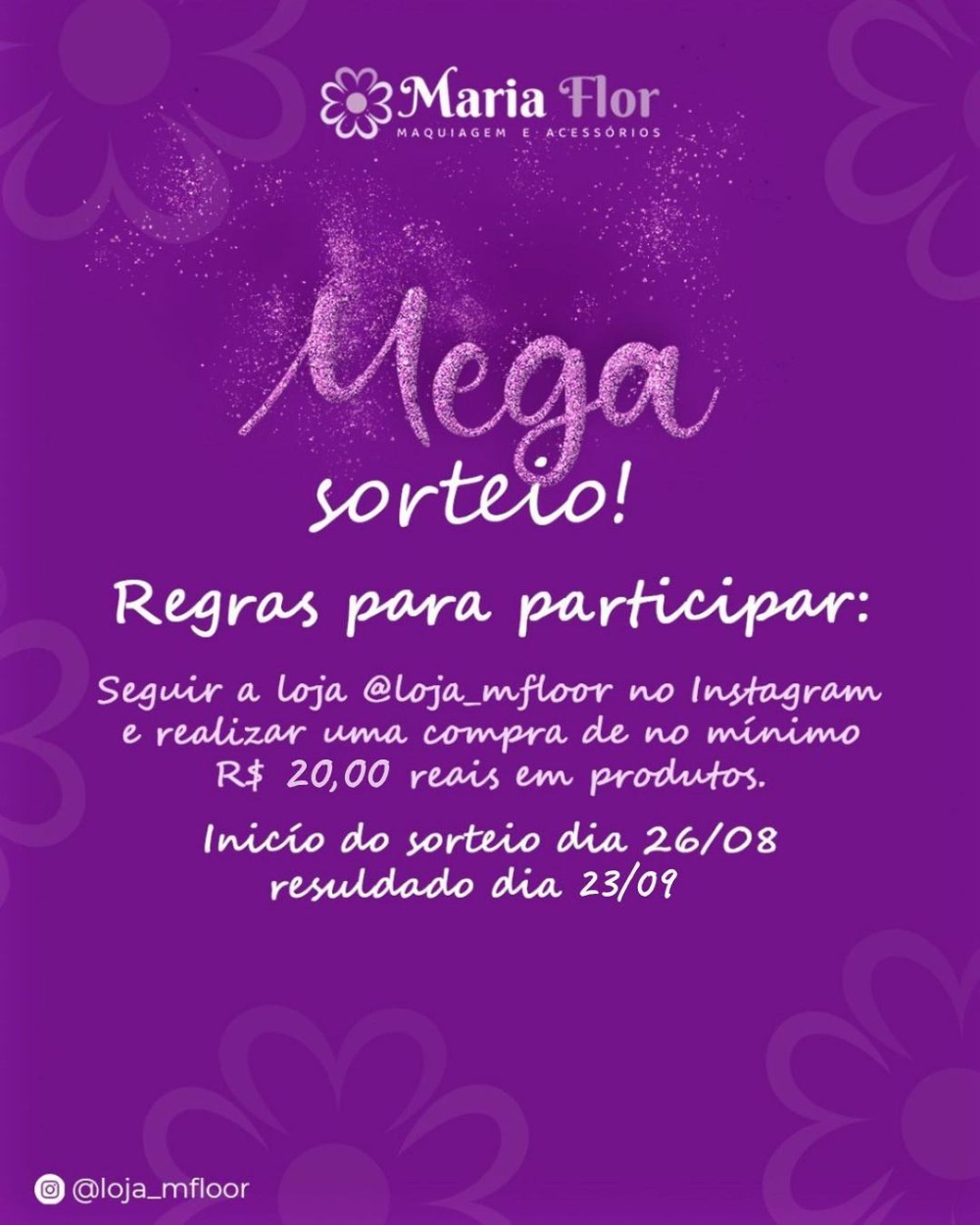- Seguir a loja @loja_mfloor no Instagram e realizar uma compra de no mínimo R$ 20,00 reais em produtos;