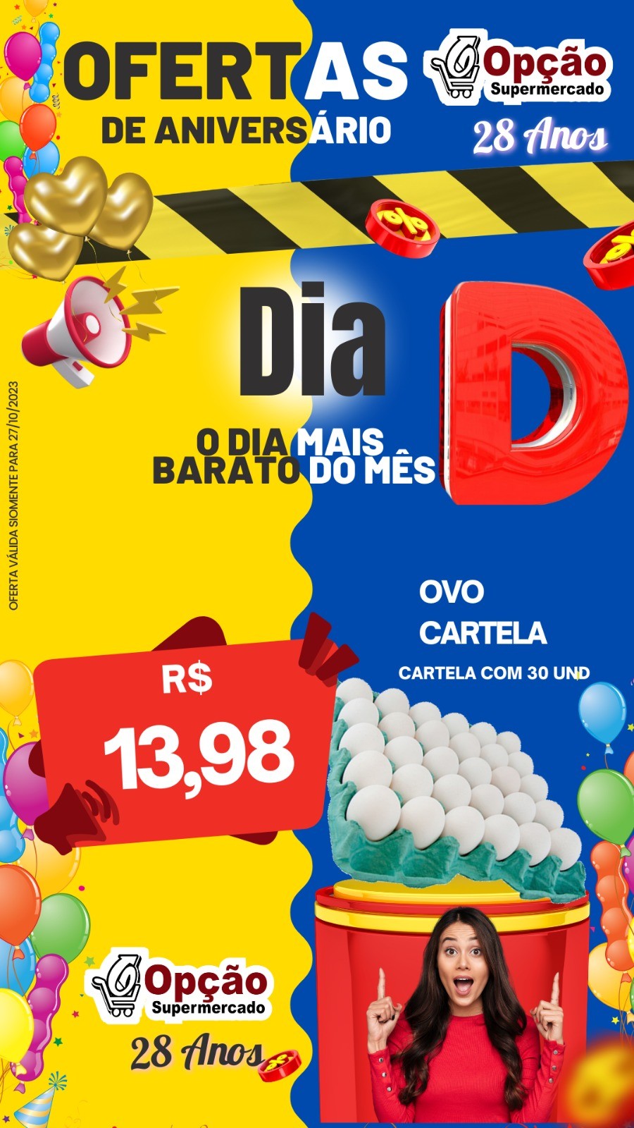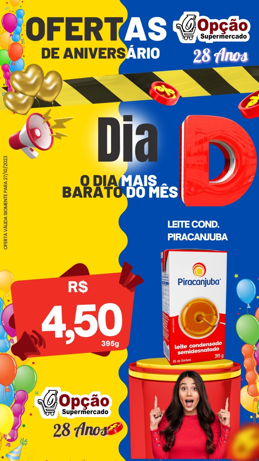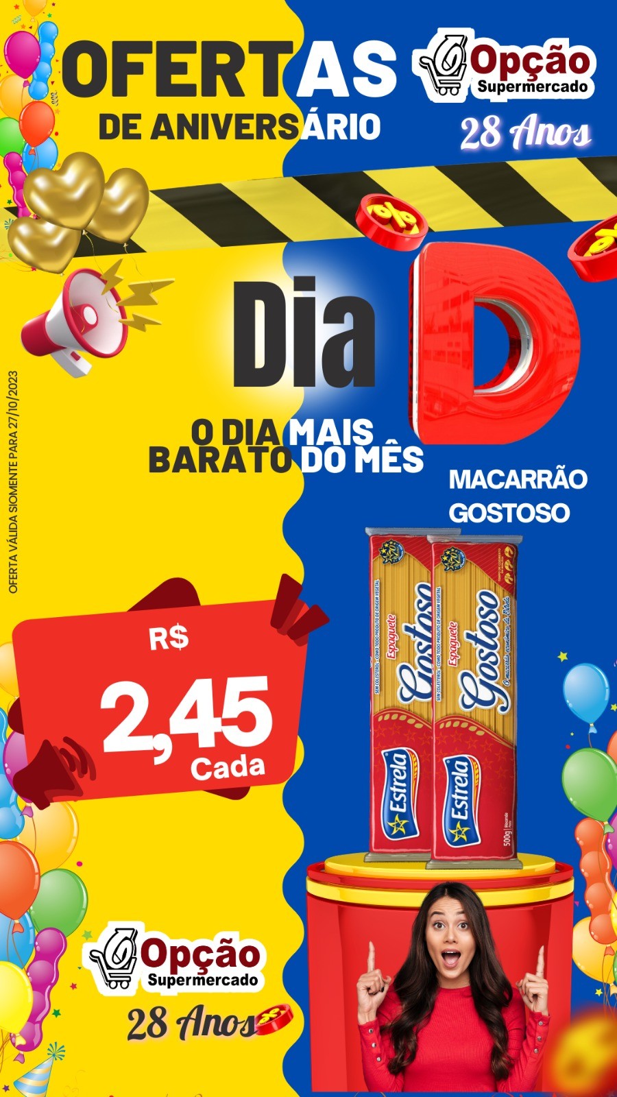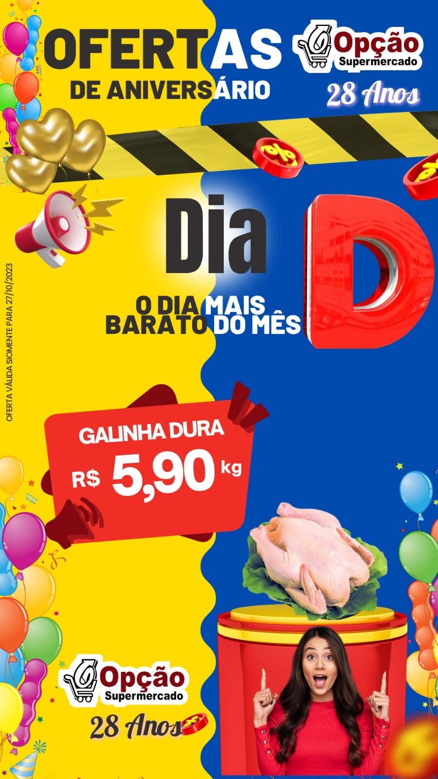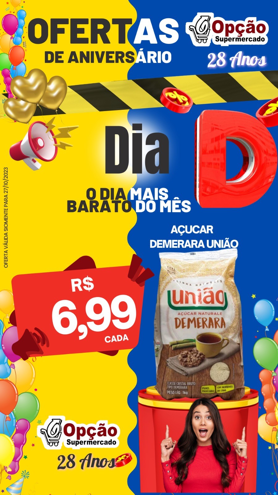 Nessa sexta-feira, 27 de outubro, o Opção Supermercado celebra 28 anos de qualidade e economia. Para comemorar este marco especial, estamos oferecendo uma ampla seleção de produtos de alta qualidade a preços imbatíveis na cidade. Não há necessidade de procurar em outro lugar, pois estamos trazendo ofertas surpreendentes para o tão aguardado 'Dia D', o dia mais barato do mês!