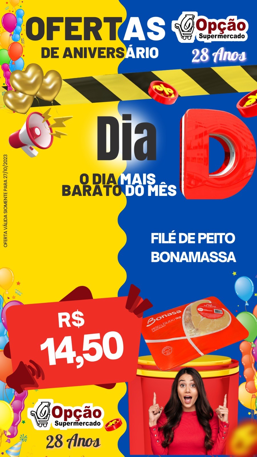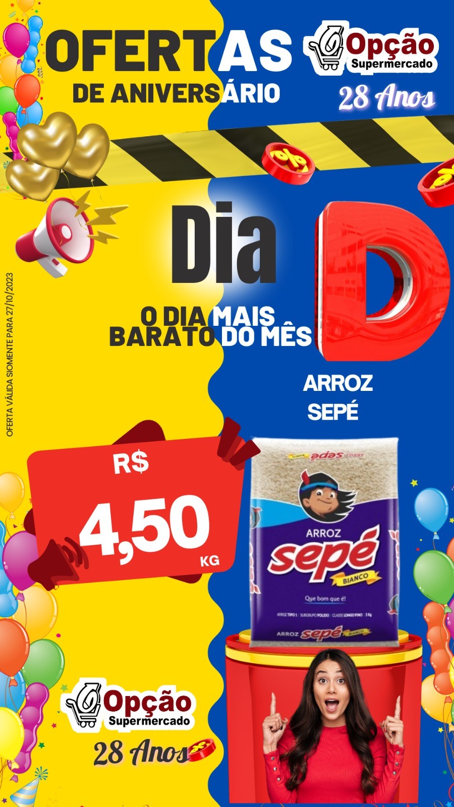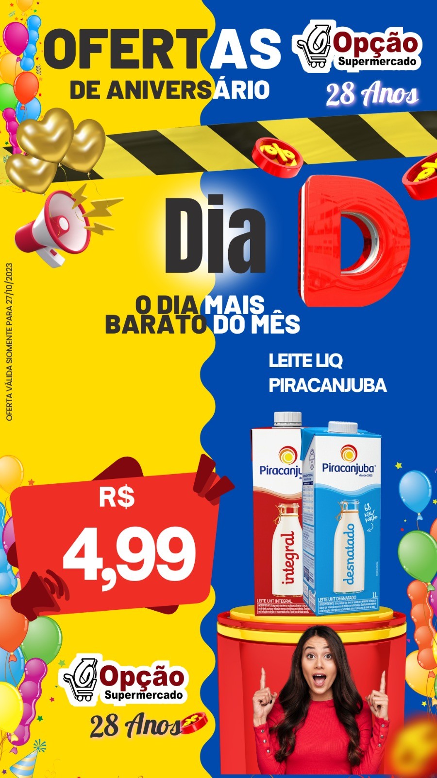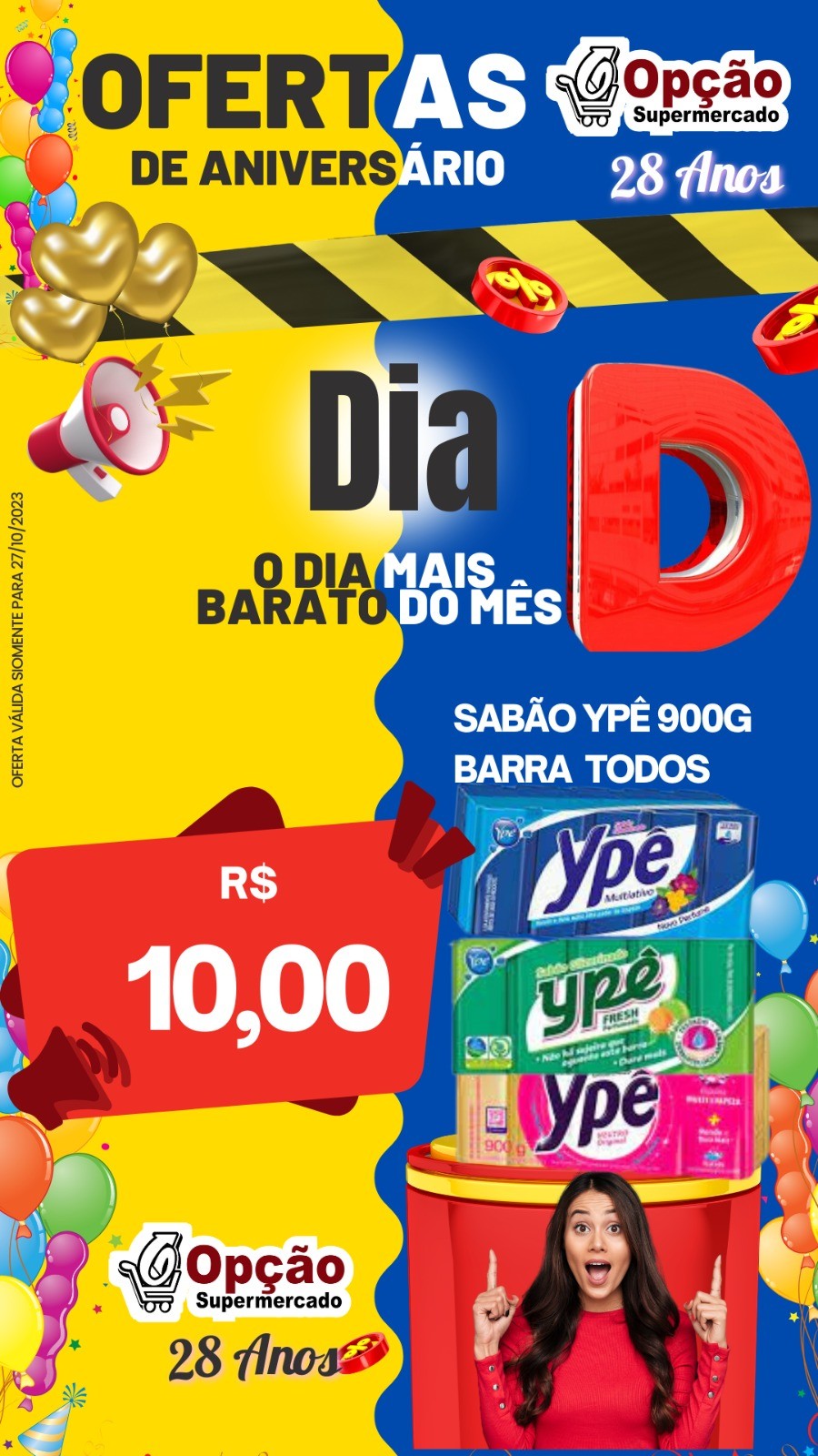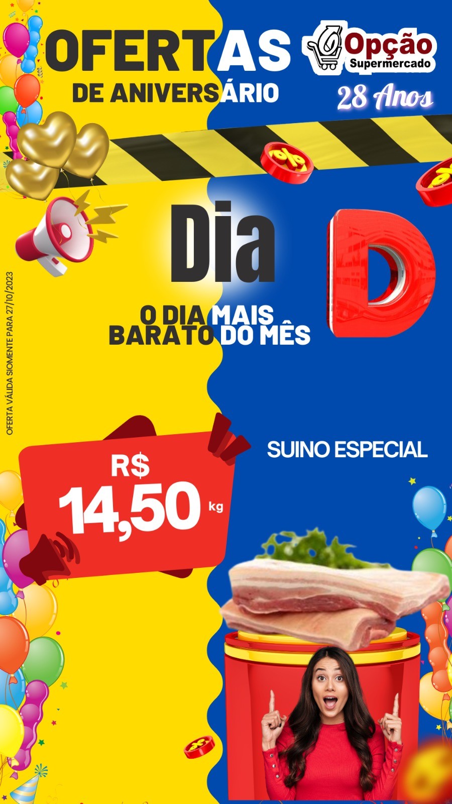 Nessa sexta-feira, 27 de outubro, o Opção Supermercado celebra 28 anos de qualidade e economia. Para comemorar este marco especial, estamos oferecendo uma ampla seleção de produtos de alta qualidade a preços imbatíveis na cidade. Não há necessidade de procurar em outro lugar, pois estamos trazendo ofertas surpreendentes para o tão aguardado 'Dia D', o dia mais barato do mês!