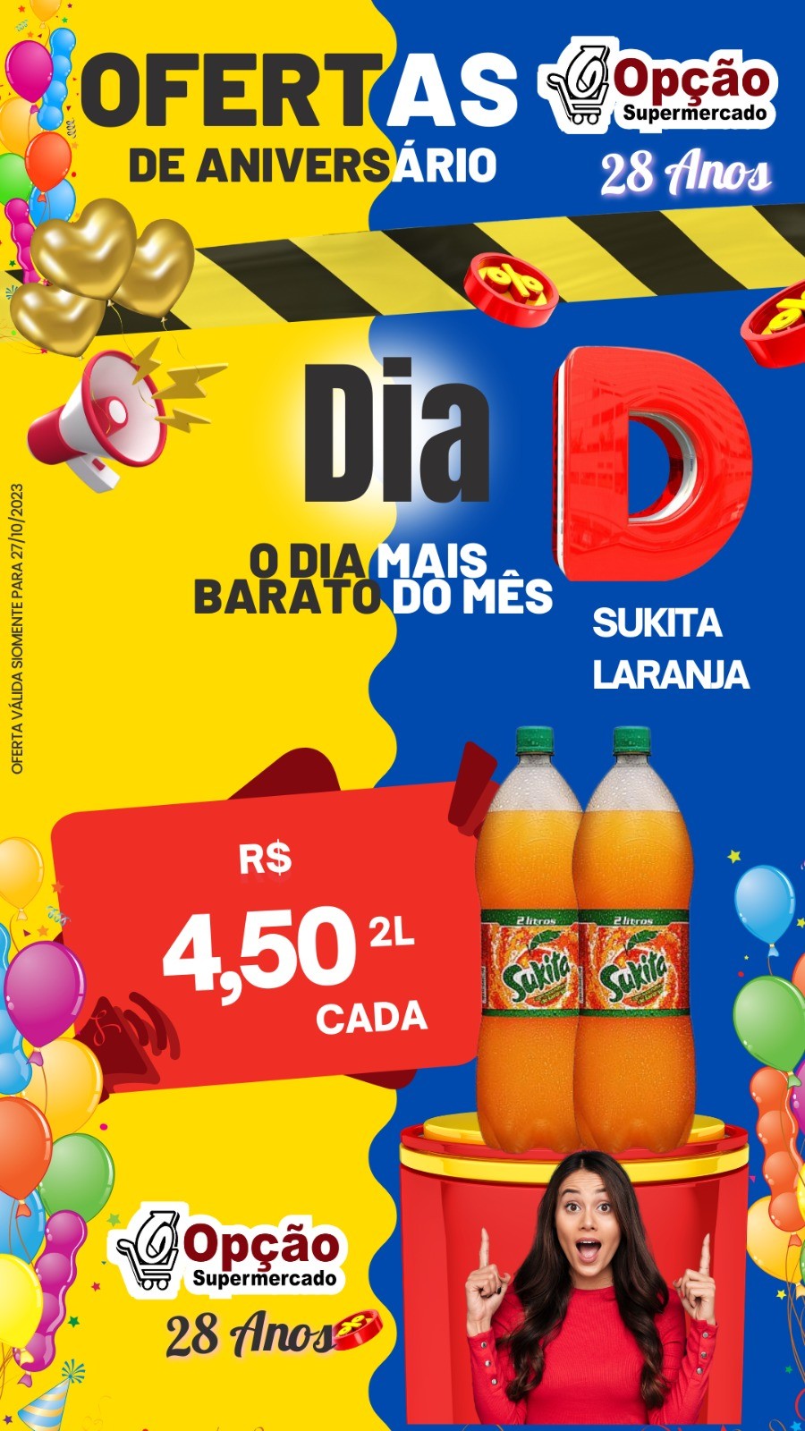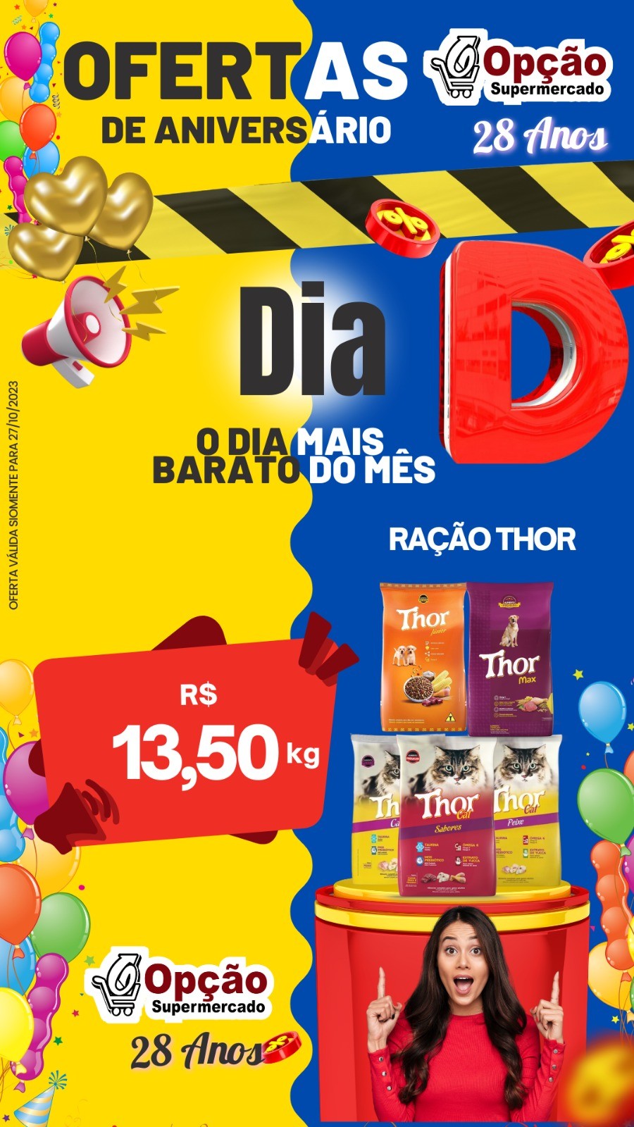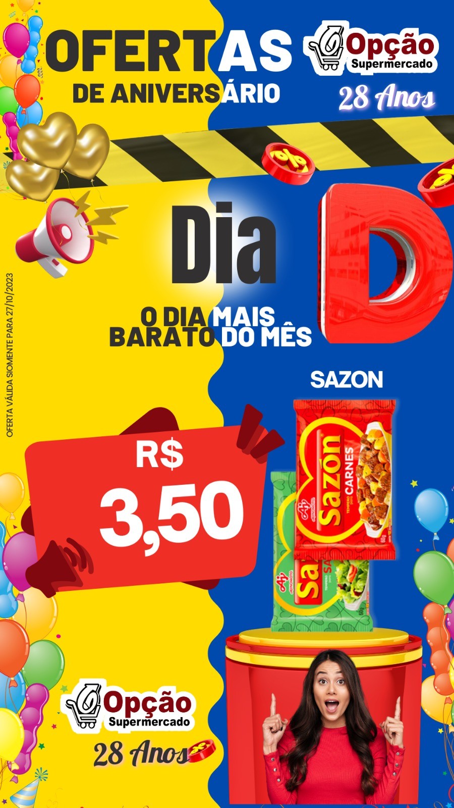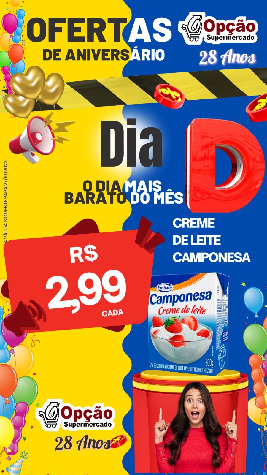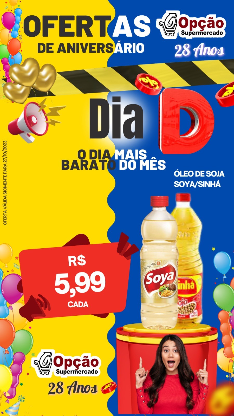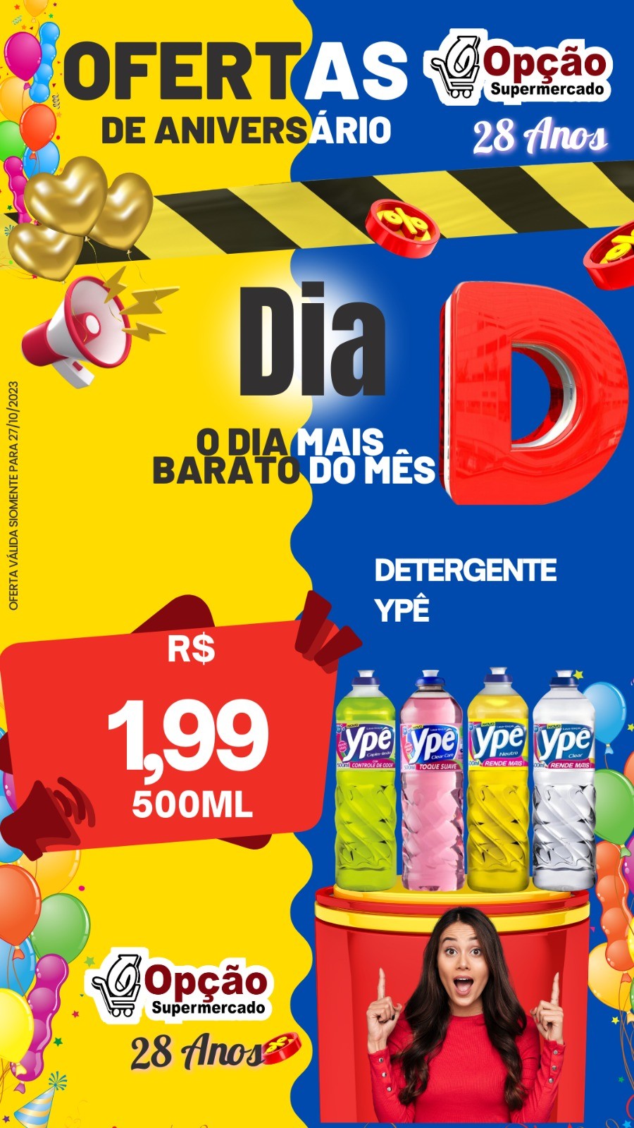 Nessa sexta-feira, 27 de outubro, o Opção Supermercado celebra 28 anos de qualidade e economia. Para comemorar este marco especial, estamos oferecendo uma ampla seleção de produtos de alta qualidade a preços imbatíveis na cidade. Não há necessidade de procurar em outro lugar, pois estamos trazendo ofertas surpreendentes para o tão aguardado 'Dia D', o dia mais barato do mês!