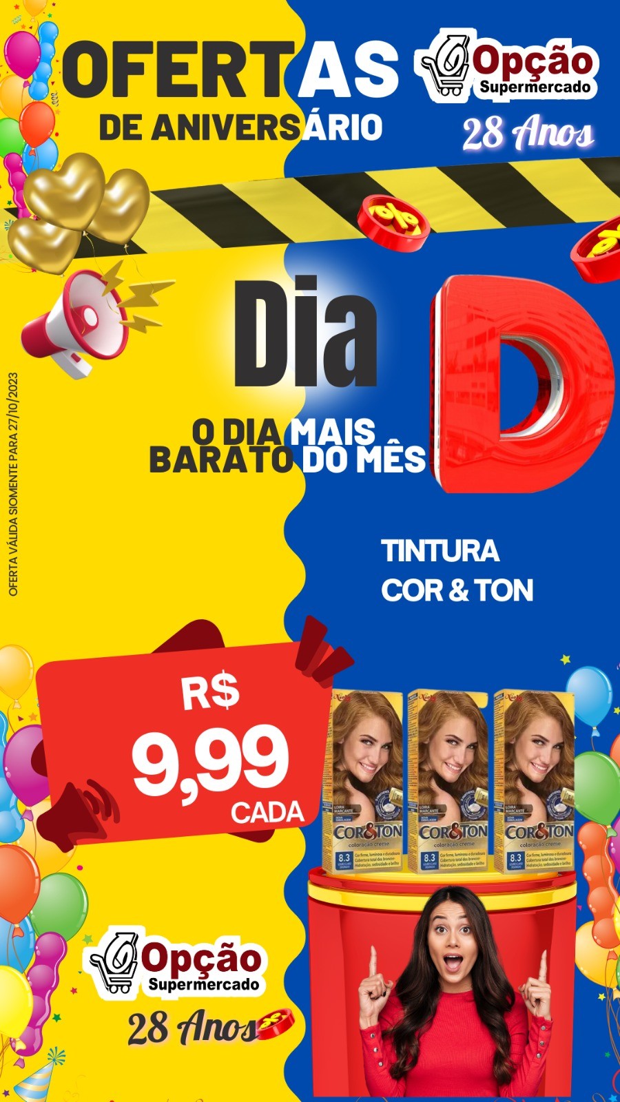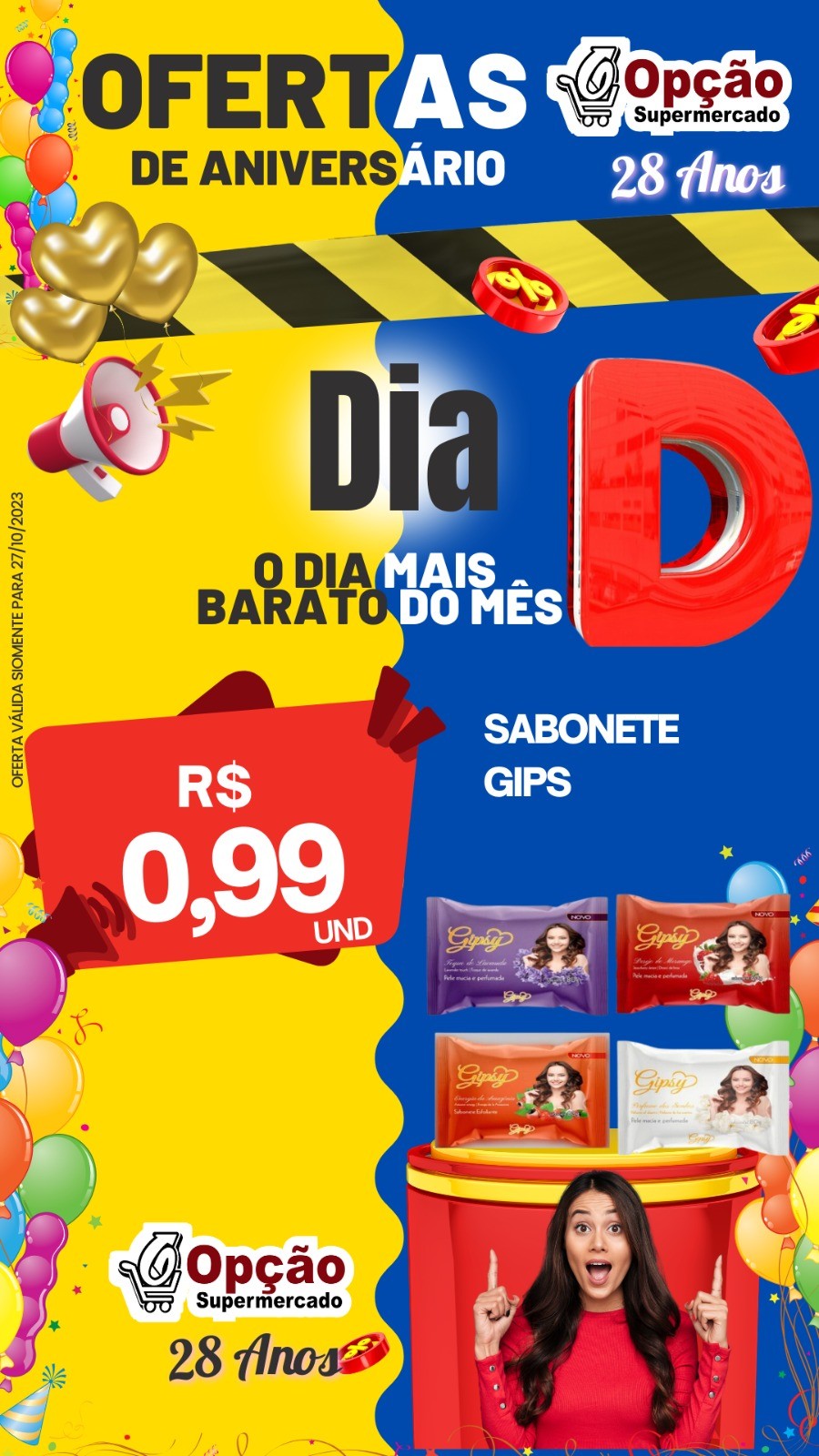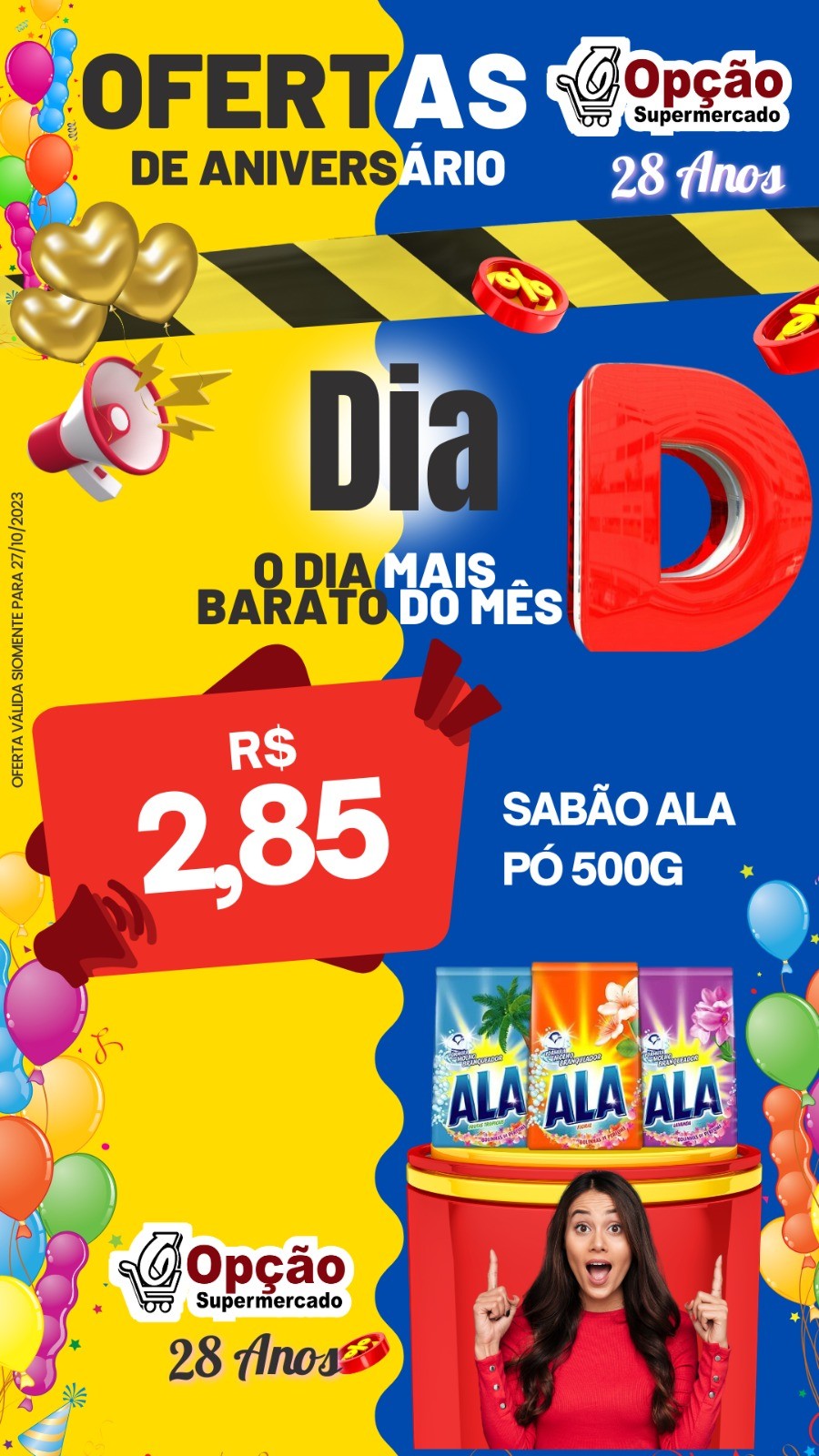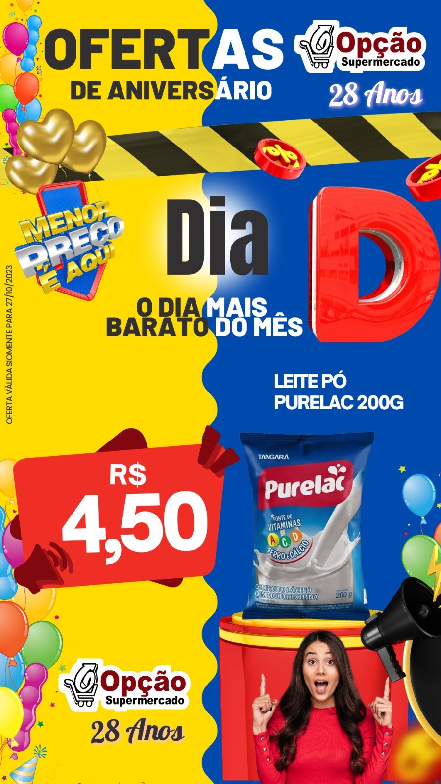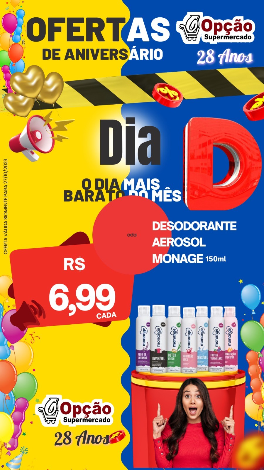 Nessa sexta-feira, 27 de outubro, o Opção Supermercado celebra 28 anos de qualidade e economia. Para comemorar este marco especial, estamos oferecendo uma ampla seleção de produtos de alta qualidade a preços imbatíveis na cidade. Não há necessidade de procurar em outro lugar, pois estamos trazendo ofertas surpreendentes para o tão aguardado 'Dia D', o dia mais barato do mês!