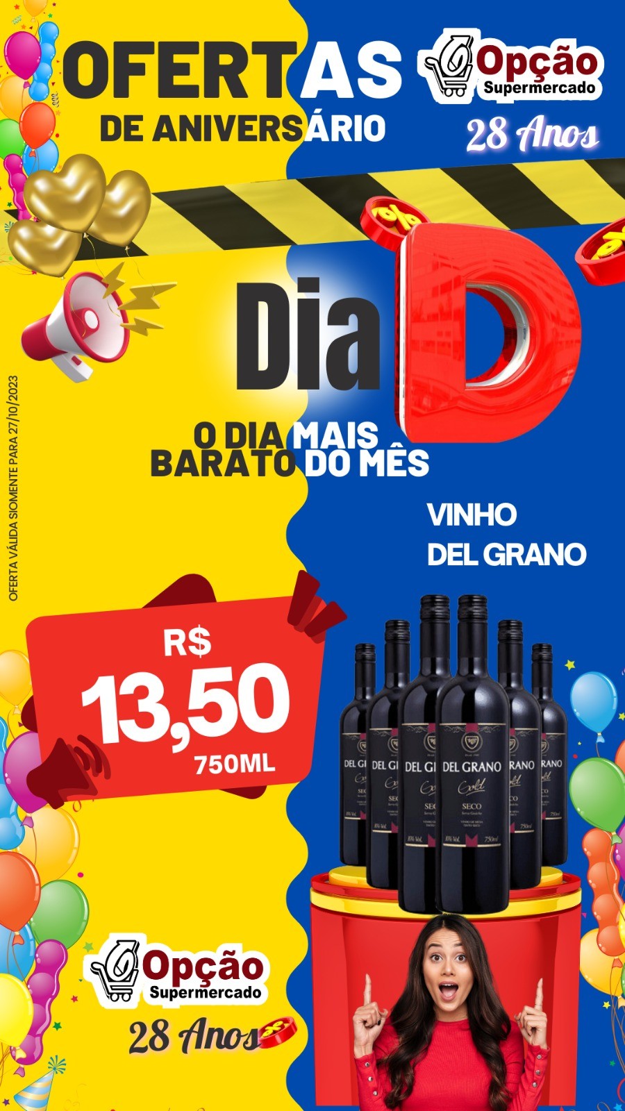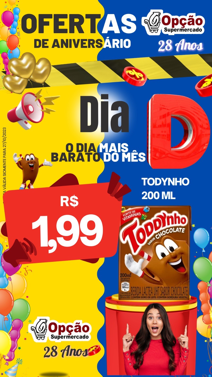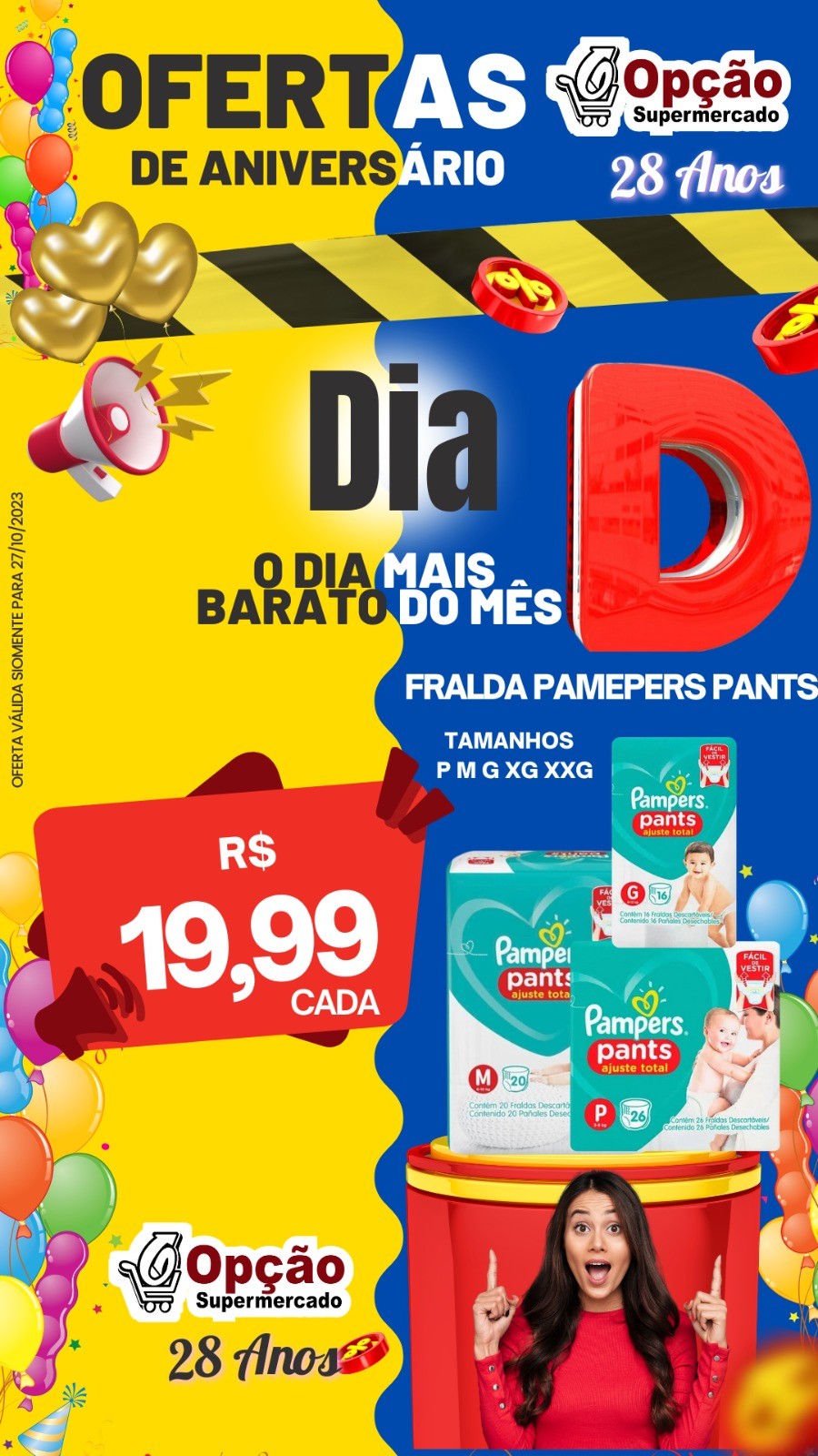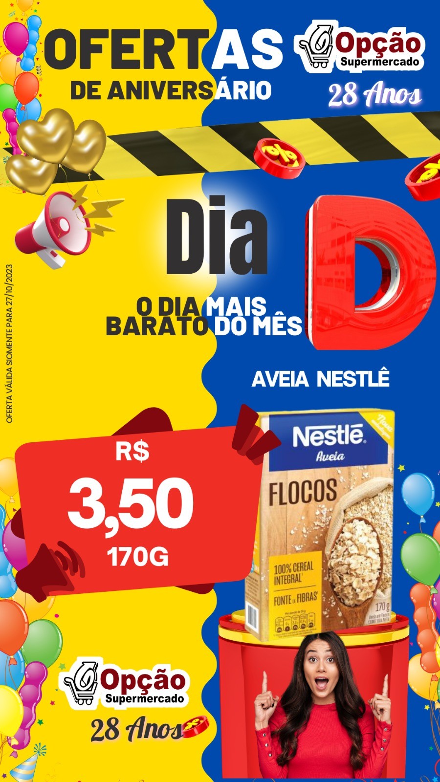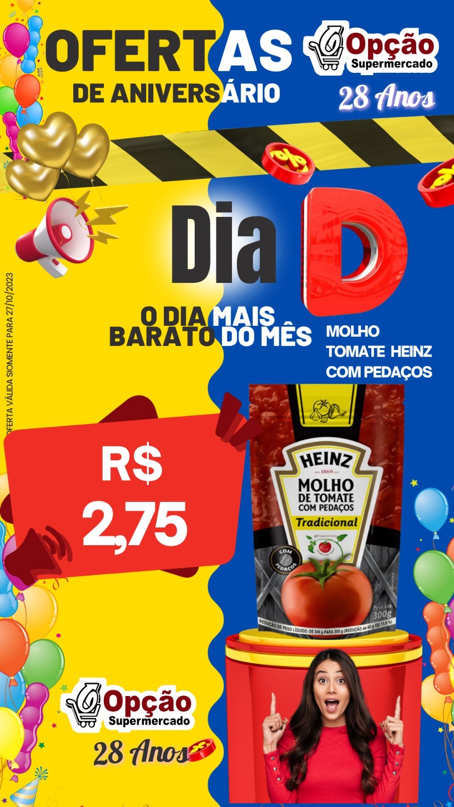 Nessa sexta-feira, 27 de outubro, o Opção Supermercado celebra 28 anos de qualidade e economia. Para comemorar este marco especial, estamos oferecendo uma ampla seleção de produtos de alta qualidade a preços imbatíveis na cidade. Não há necessidade de procurar em outro lugar, pois estamos trazendo ofertas surpreendentes para o tão aguardado 'Dia D', o dia mais barato do mês!