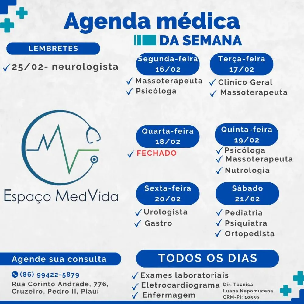 Confira a agenda semanal do Espaço MedVida e organize os cuidados com sua saúde!